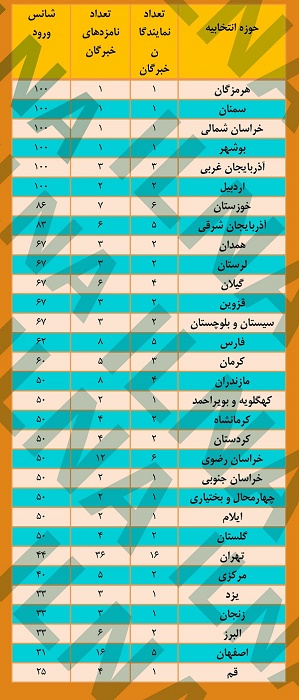 طبق اطلاعات این جدول در وضعیت فعلی، تمامی نامزدهای حوزههای انتخابیه هرمزگان، سمنان، خراسان شمالی، بوشهر، آذربایجان غربی و اردبیل برای مجلس خبرگان انتخاب شدند بنابراین نتیجه انتخابات در بیست درصد حوزههای انتخابیه قبل از برگزاری انتخابات مشخص است.