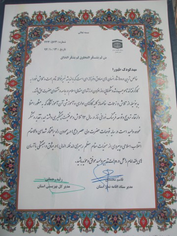 البرز گلستان/مراسم تقدیر از مهدکودک برتر قرآنی استان گلستان که در همایش نماز استان انتخاب گردید امروز بعد از ظهر قاسم محمدی دبیر اقامه نماز استان و ساور چمنی مدیر کل گزینیش استانداری گلستان و حاج آقا شاکری از موسسه موضوع شناسی احکام فقهی و کارشناس خد ترخص و شهردار کردکوی و محمودی مدیر تبلیغات اسلامی شهرستانی کیانی رئیس بهزیستی شهرستان و مدیر گروه خبر البرز گلستان و مربیان و خانواده های نونهالان قرآنی در محل مهد کودک برگزار گردید.