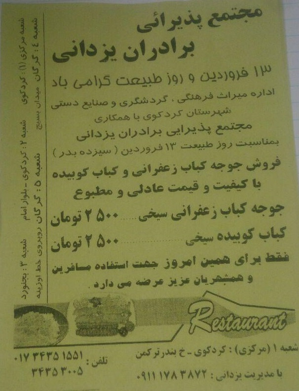 البرز گلستان/ به مناسبت 13 فروردین روز طبیعت ابتکار جالبی از سوی مجتمع پذیرایی برادران یزدانی در شهرستان کردکوی انجام شده است که باعث جذب گردشگر در شهرستان شده است . این مجتمع که بیش از 40سال قدمت دارد توانسته است همه ساله گردشگران زیادی را در منطقه با پخت غذای ایرانی ومحلی جذب کند .و حتی در مسابقات استانهای مختلف در این زمینه دارای مقام شده است.