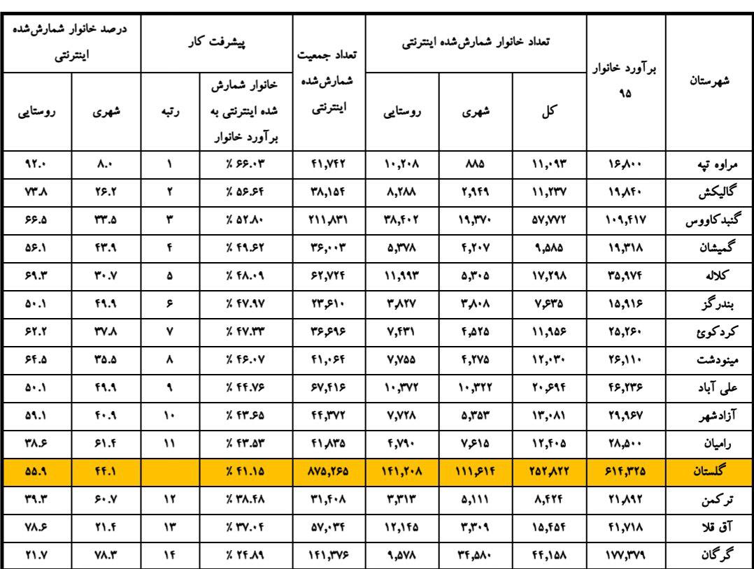 البرز گلستان/ تازه ترین رتبه بندی شهرستانهای استان در سرشماری اینترنتی سال 95/ تا ساعت 22 دوشنبه 26 مهر/ آخرین مهلت تا ساعت 24 امروز سه شنبه 27 مهر از طریق سایت Www.sarshomari95.ir