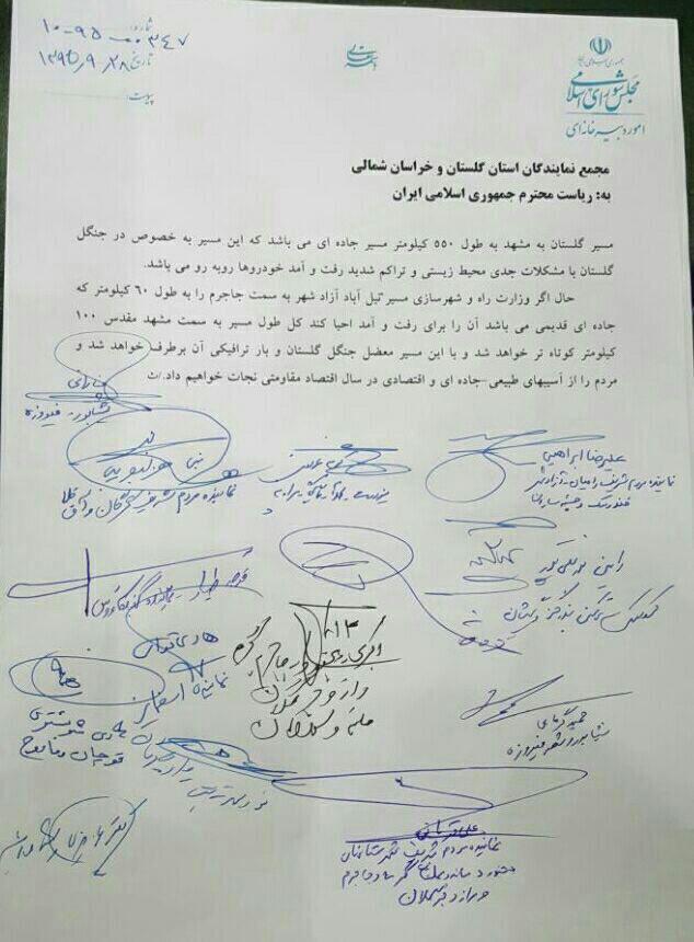 البرز گلستان/نامه مجمع نمایندگان استان گلستان و خراسان شمالی به ریاست محترم جمهوری در خصوص احیاء جاده مشهد به گرگان از مسیر جاجرم
