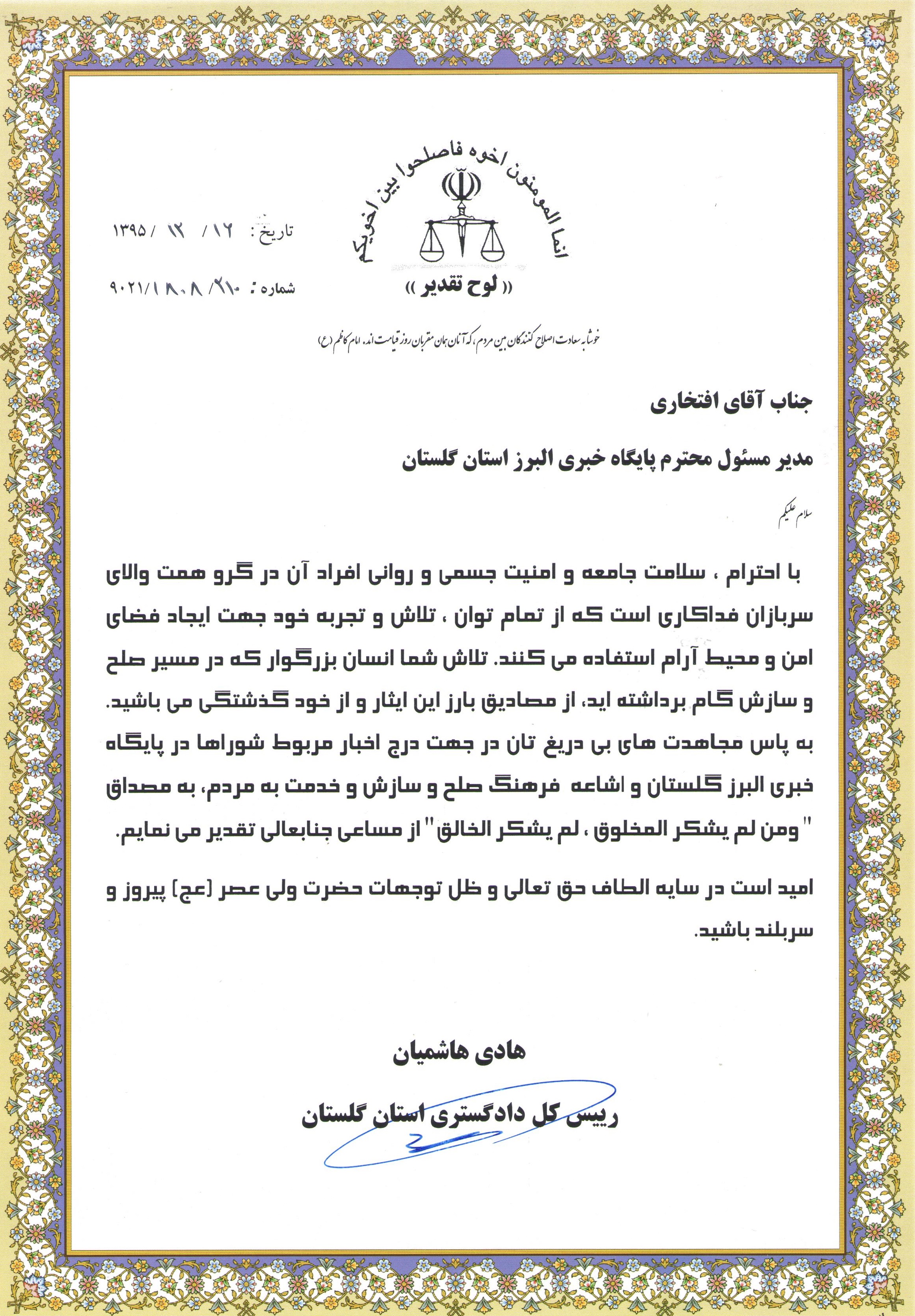 البرز گلستان/از سوی دکتر هاشمیان رئیس کل دادگستری استان گلستان از گروه خبر البرز گلستان بواسطه تلاش در جهت سلامت جامعه وامنیت جسمی جامعه که در مسیر صلح و سازش نسبت به درج اخبار شورای حل اختلاف استان و حمایت برنامه های قضایی استان لوح تقدیر صادر و طی مراسمی با حضور معاون قوه قضاییه و دادستان مرکز استان و مدیران قضایی استان تحویل مدیر گروه خبر البرز گلستان شد.
