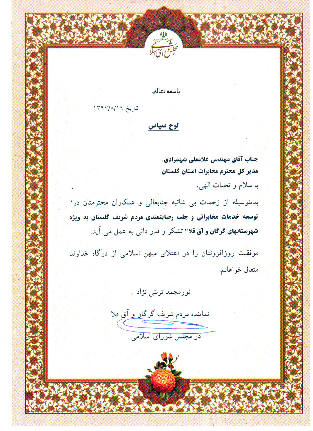 در این لوح تقدیر از مهندس غلامعلی شهمرادی و کارکنان مخابرات منطقه گلستان به جهت توسعه خدمات مخابراتی وجلب رضایت مندی مردم عزیز استان گلستان تقدیر شده است .