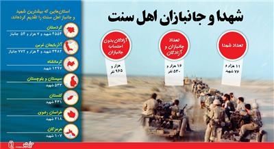 ?بر اساس اطلاعات مندرج در این اینفوگرافیک، تعداد شهدای اهل سنت 11 هزار و 700 شهید و تعداد جانبازان و آزادگان اهل سنت 16 هزار و 530 نفر و تعداد آزادگان اهل سنت بدون احتساب جانبازان 1965 نفر می باشد. @alborzegolestan