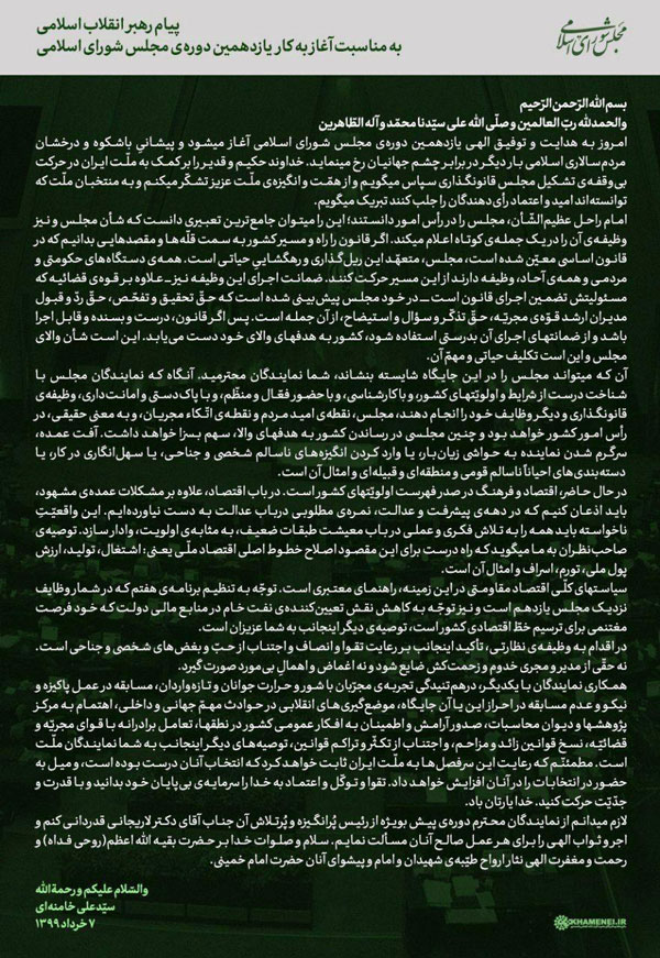 متن کامل پیام رهبر انقلاب اسلامی به مناسبت آغاز به کار یازدهمین دورهی مجلس شورای اسلامی