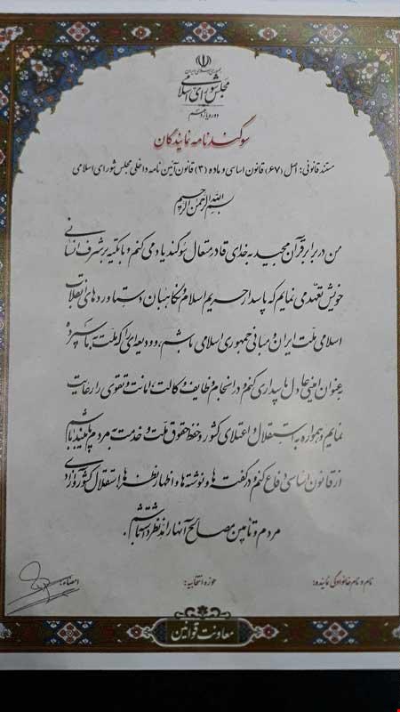 «من در برابر قرآن مجید به خدای متعال سوگند یاد میکنم و با تکیه بر شرف انسانی خویش تعهد میکنم که پاسدار حریم اسلام و نگهبان دستاوردهای انقلاب اسلامی ملت ایران و مبانی جمهوری اسلامی باشم. همچنین ودیعهای که ملت به ما سپرده به عنوان امینی عادل پاسداری کنم، و در انجام وظایف وکالت، امانت و تقوا را رعایت نمایم و همواره به استقلال و اعتلای کشور و حفظ حقوق ملت و خدمت به مردم پایبند باشم، از قانون اساسی اطاعت کنم و در گفتهها و نوشتهها و اظهار نظرها استقلال کشور و آزادی مردم و تامین مصالح آنان را مدنظر داشته باشم.»