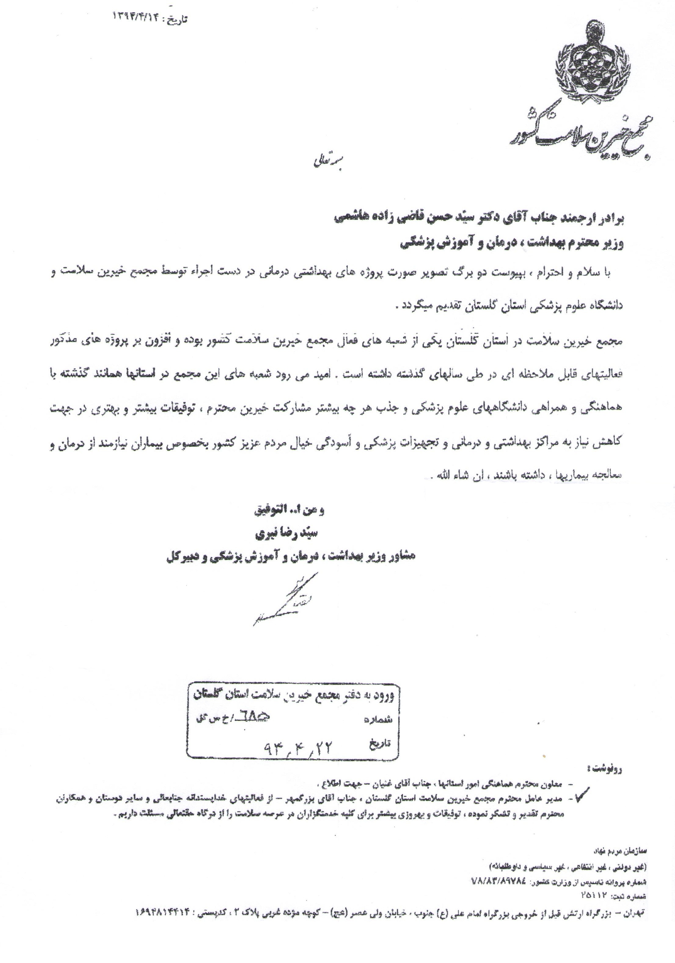 در این نامه دبیر کل مجمع خیرین سلامت کشور ابراز نمود: مجمع خیرین سلامت گلستان یکی از شعبه های فعال مجمع خیرین کشور بوده که افزون بر پروژ ه های مذکور فعالیتهای قابل ملاحظه ی در طی سالهای گذشته داشته است .و امید می رود شعبه های این مجمع در استانها همانند گذشته با هماهنگی دانشگاههای علوم پزشکی و جذب هر چه بیشتر مشارکت خیرین محترم توفیقات و بهتری در جهت کاهش نیاز به مراکز بهداشتی و درمانی و تجهیزات و آسودگی خیال مردم عزیز کشور بخصوص بیماران نیازمند از درمان بیماریها داشته باشند.