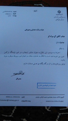 به گزارش گروه فرهنگ و هنر پایگاه خبری البرز گلستان آق مرادکر از فرهنگیان با سابقه و فعال فرهنگی اجتماعی بندر ترکمن و گمیشان طی حکمی از سوی فضیلت مدیر کل ارشاد اسلامی استان گلستان بعنوان مشاور امور فرهنگ ترکمن انتخاب شده است .